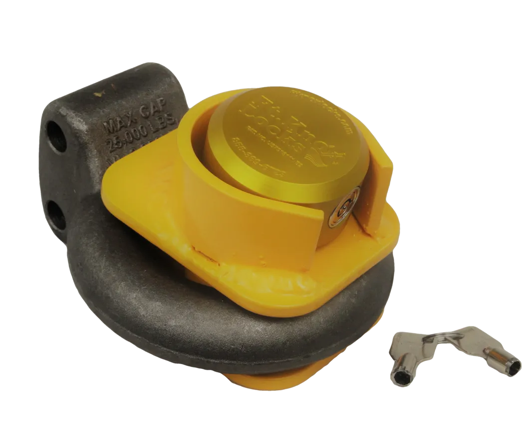 1/4″ top and bottom plates with a 3/8″ lock “mast” which accepts most puck style locks (sold separately). This is a no-nonsense design which will required power tools, noise or a cutting torch to defeat. We sell several different puck locks with varying levels of security. Do call us if you have any questions. Be sure to check out our installation video HERE We offer fleet discount for quantities of 10 or more Ft. Knox Locks purchased. Made in America.